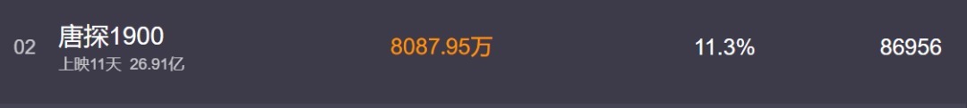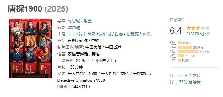 2025年,《唐探1900》上映,放置2月8日晚,《唐探1900》已拿下票房26.91亿票房;豆瓣评分为6.4分。
