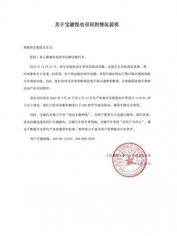 上汽通用五菱有关讲求东谈主示意,2024年12月31日,部分宝骏悦也车型突发制动问题。宝骏汽车对此高度心疼,第一时候聚焦车主诉求。“经排查,由于特定批次软件问题,导致车辆在特定日历可能出现制动助力失效的风险。为此,咱们向受本次事件影响的用户致以古道的歉意,并依据国度有关条例启动居品调回门径。”