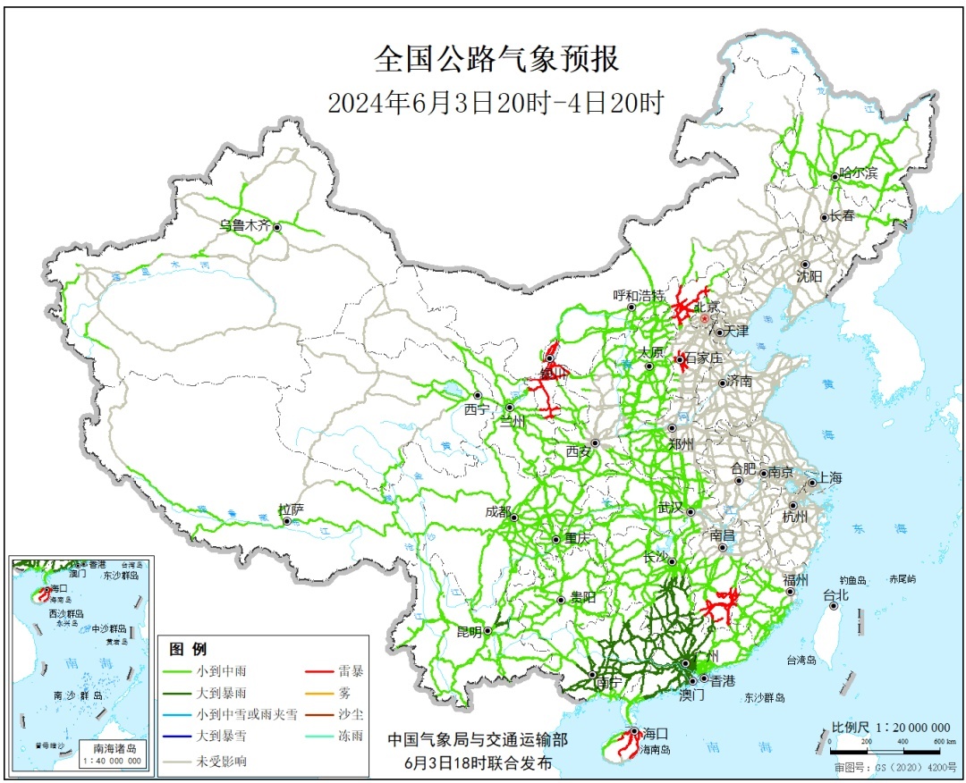 6月3日晚,交通运载部发布寰宇公路表象预告(6月3日20时至4日20时),提到广东部分路段受大到暴雨影响。
