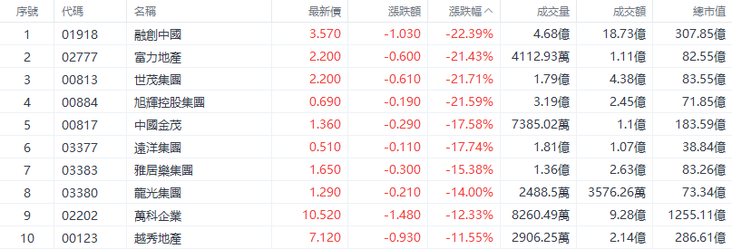个股方面,其中,内房股多股从升逾10%直线跳水,融创中国跌超22%,富力跌产、世茂集团、旭辉控股集团跌超21%,中国金茂、远洋集团跌超17%。