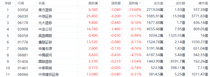 中资券商股广漠走低,东方证券跌超13%,中信证券跌超11%,光大证券(维权)、中金公司跌超8%。