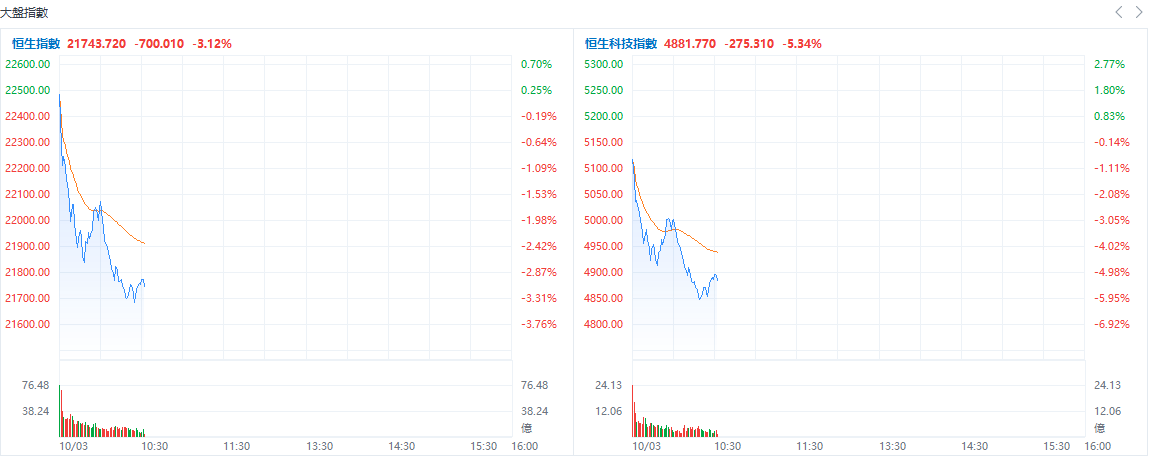 早间开盘,港股出现改动。恒生指数和恒生科技指数纷繁下落,恒指跌超3%,科指一度跌超6%。