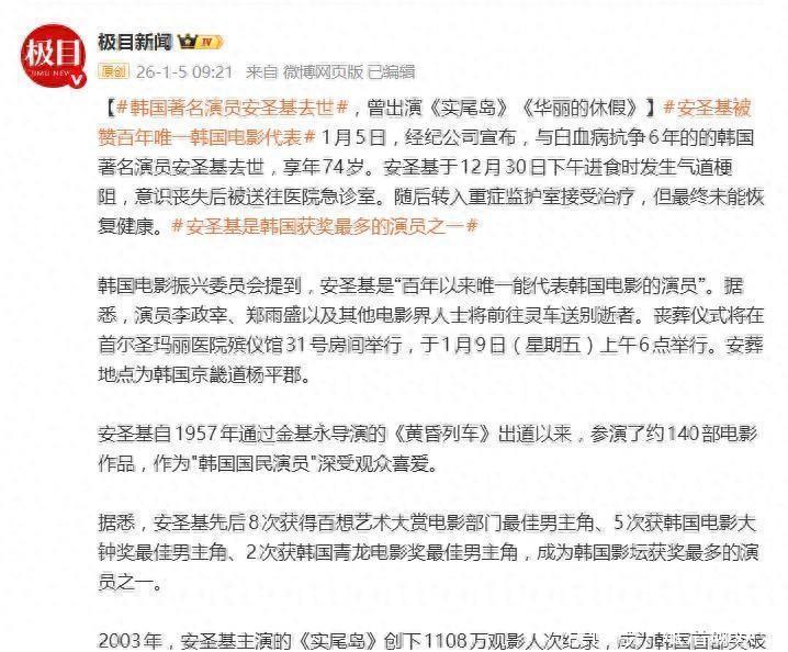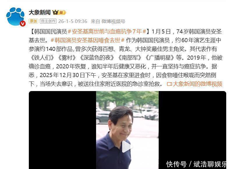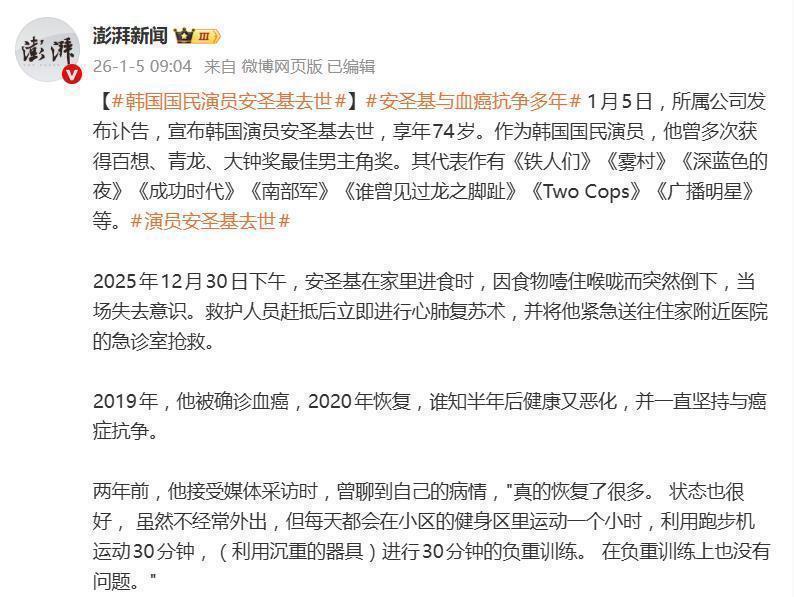 音书无疑极为千里痛。2025年12月30日,安圣基在家顶用餐时倏得发不悦谈结巴,激发腹黑骤停。尽管现场立即扩充了伏击心肺复苏并赶快送往病院,但他恒久未能规复将强。依靠呼吸机看护人命六天后,最终于2026年1月5日上昼离世,离他的74岁寿辰——1月1日,仅相隔四天。