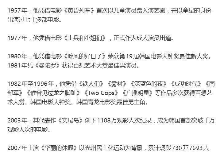 他所参与的作品多次深深镌刻于宇宙牵挂中:2003年的《实尾岛》以1,108万不雅影东谈主数,开启韩国“千万票房电影”的新纪元;2007年的《丽都的放假》以光州民主化畅通为题材,甚而招引了前总统金大中与卢武铉亲临电影院观赏。从《播送明星》到《断箭》,他所评释注解的变装早已超出银幕规模,成为阿谁时期的首要注脚。
