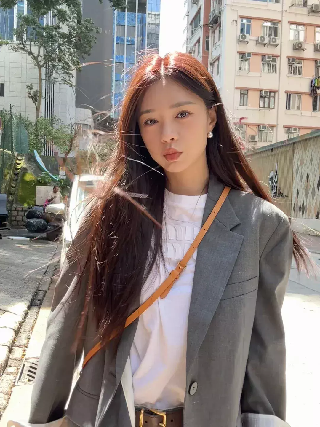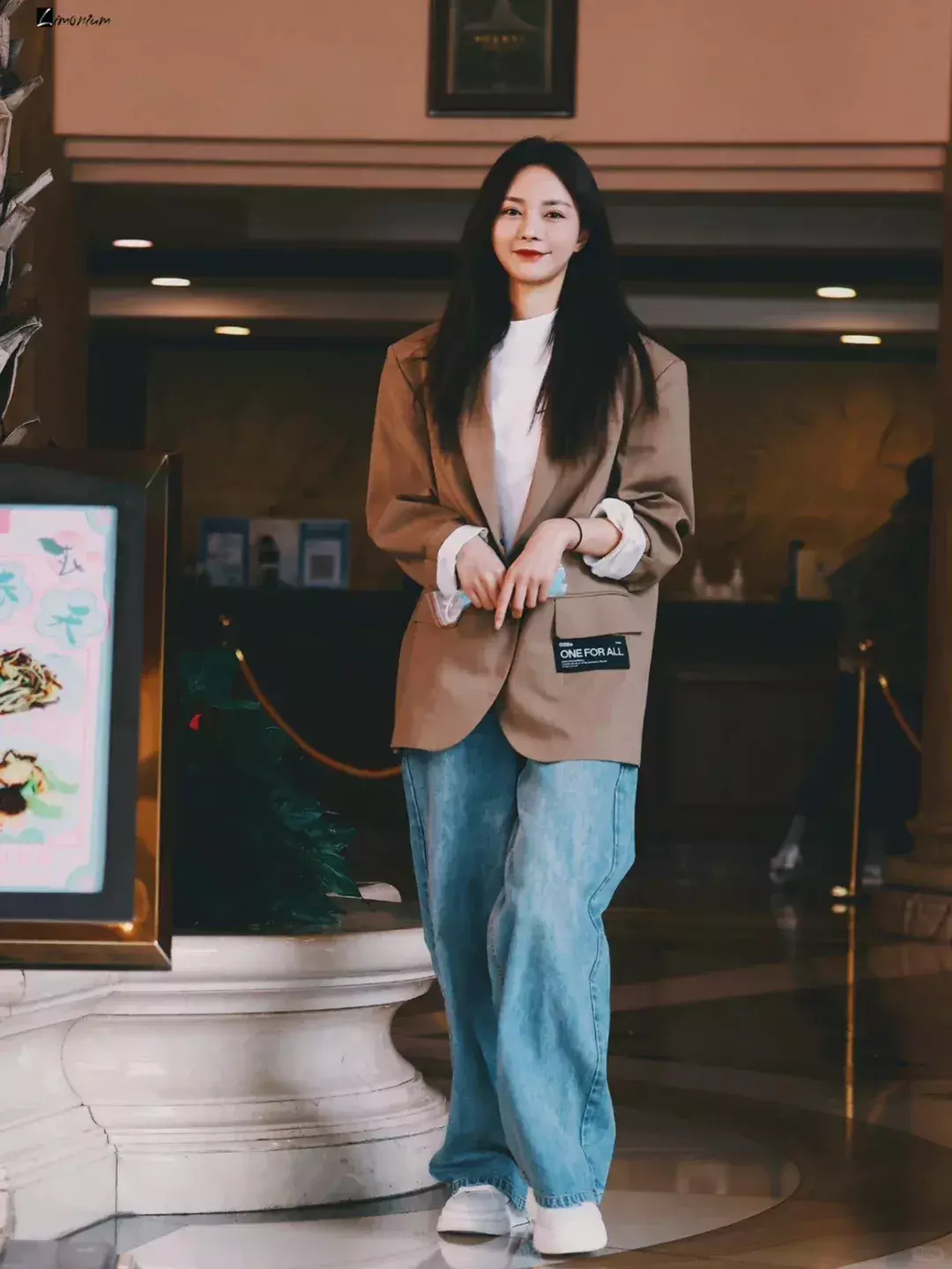 Look1:棕色西装+牛仔裤+白色T恤