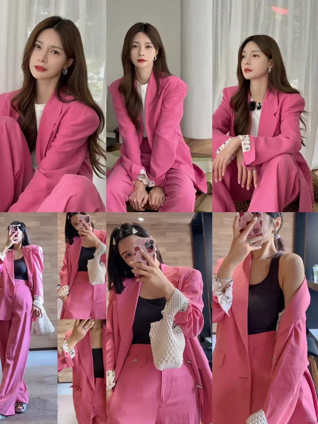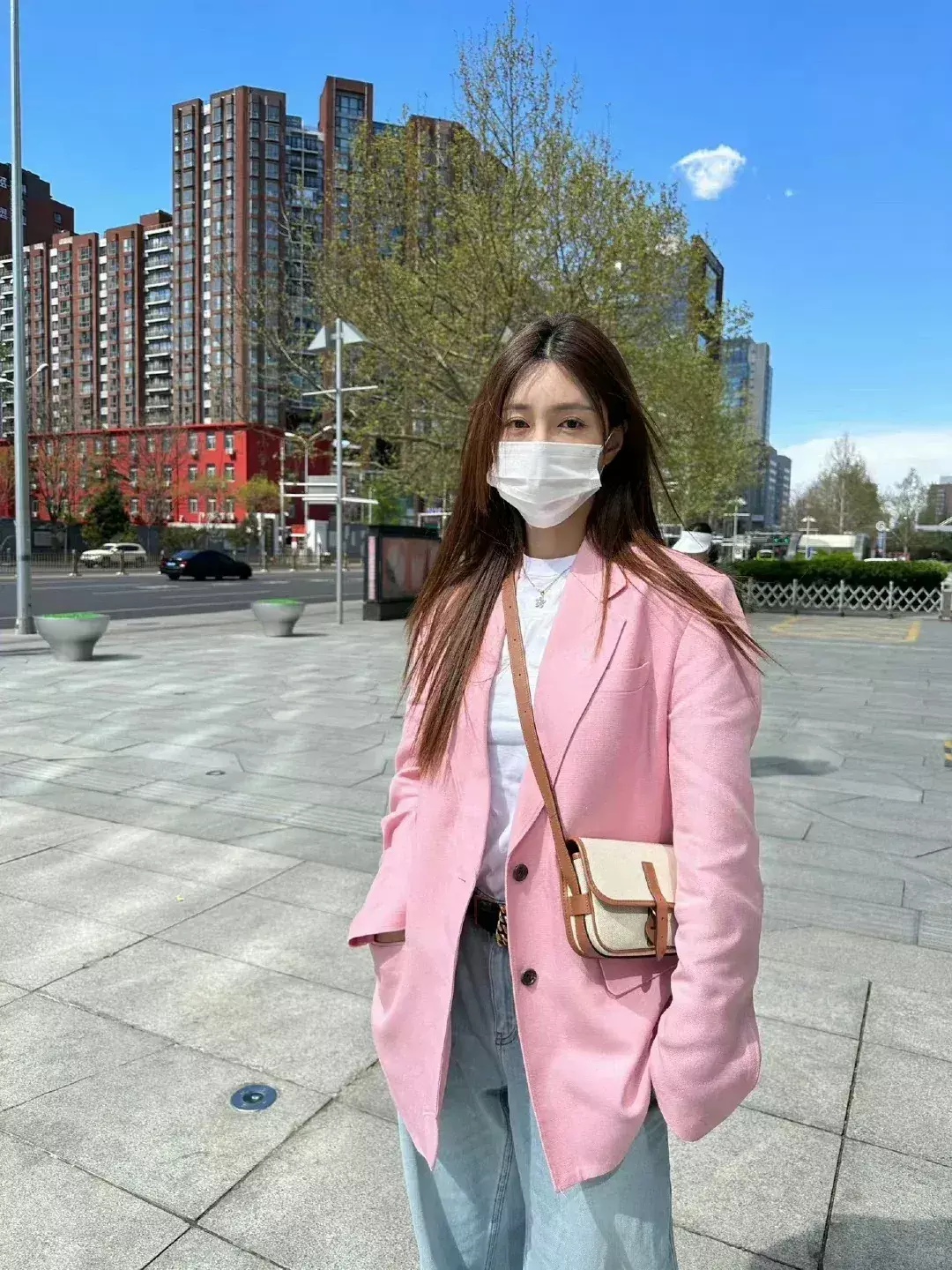 Look2:粉色西装+浅蓝直筒裤+白色打底