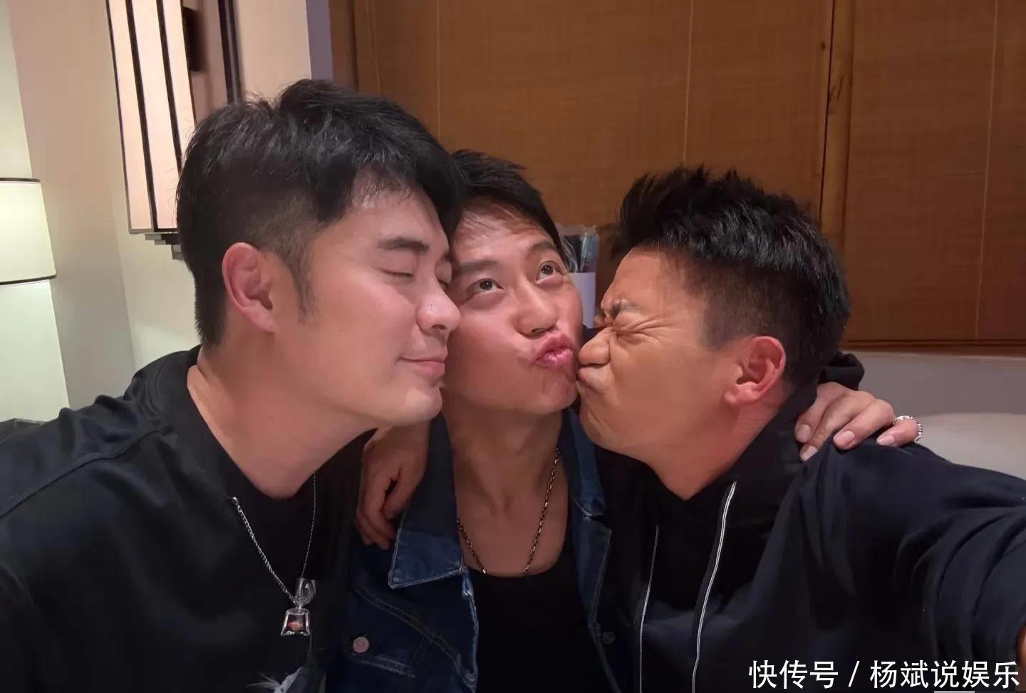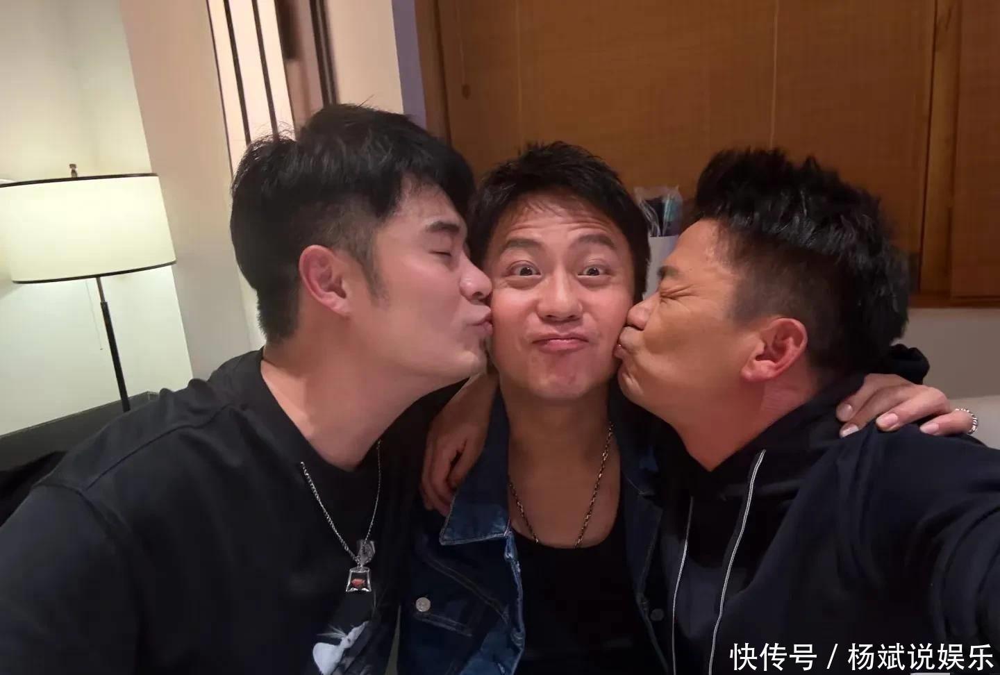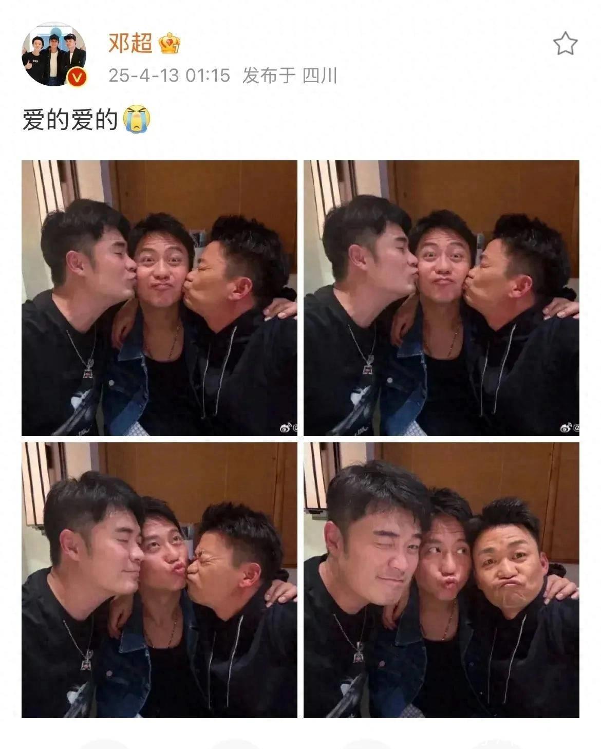 拍照时,邓超被陈赫与王宝强包围,只见邓超嘟嘴卖萌,陈赫与王宝强则对着他的脸,每东说念主送一个亲亲,他们二东说念主闭塞眼睛很深情,只消邓超瞪大了我方的双眼。