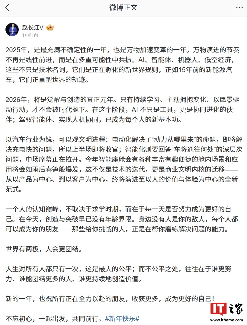 IT之家 1 月 1 日音讯足球投注app,前比亚迪腾势品牌总司理、腾势方程豹直营行状部总司理赵长江本日发布长文,共享了我方对行业的意见。他示意,AI、智能体、机器东谈主、低空经济这些不仅仅技巧名词,是正在孵化的新天下规定,正如 15 年前的新能源汽车,正重塑天下的轨迹。