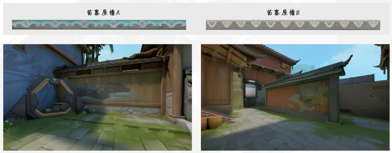 以“古寨”这张原创舆图为例,设想师用冷暖色调明晰远离攻守两边,以致连墙壁上的画图也各有不同。为保抓色调合并,幸免纷扰游戏程度,制作组还对苗寨传统屋檐式样进行翻新,断念了略显突兀的白色,选用与舆图举座派头更契合的绿色。